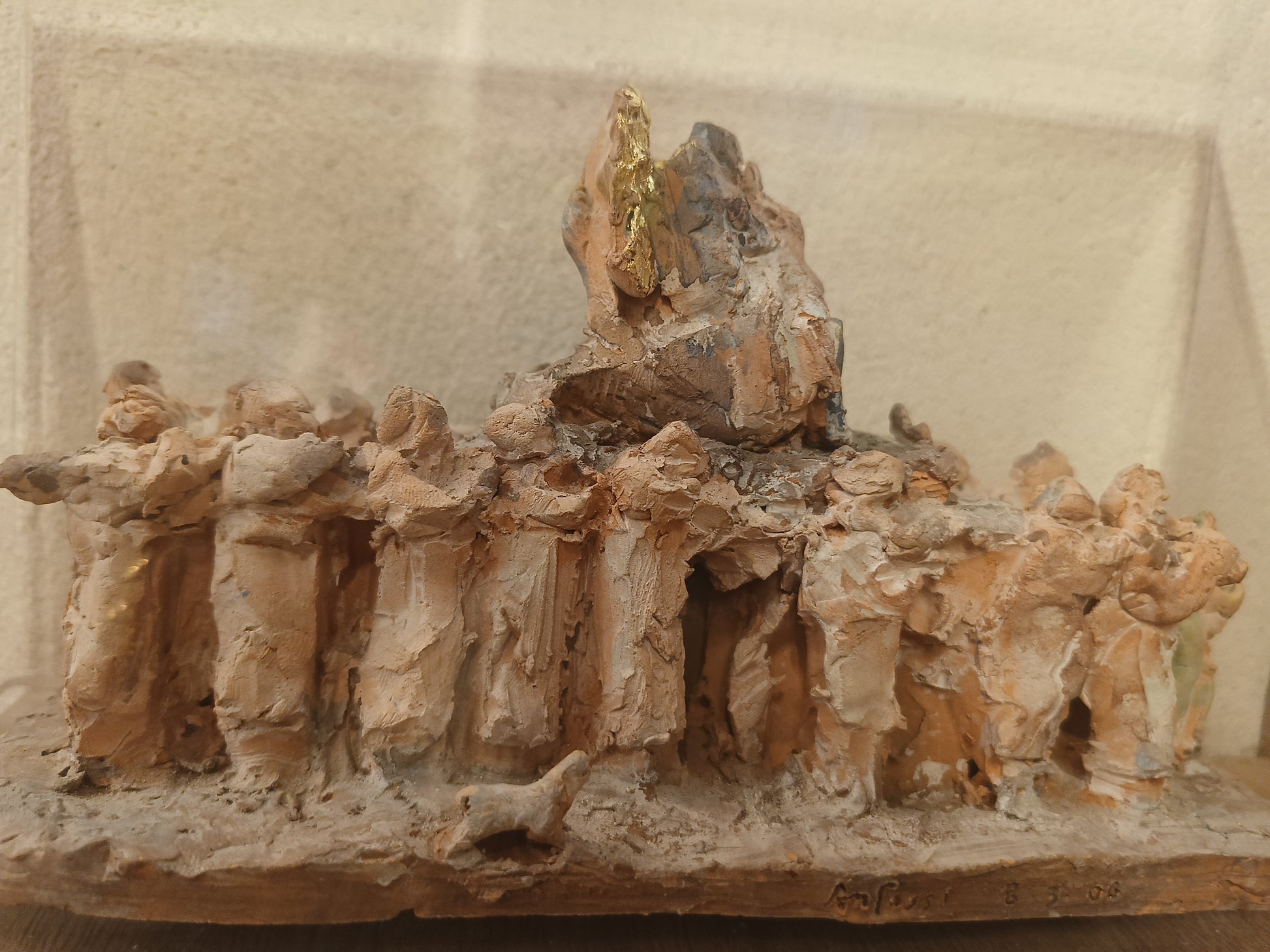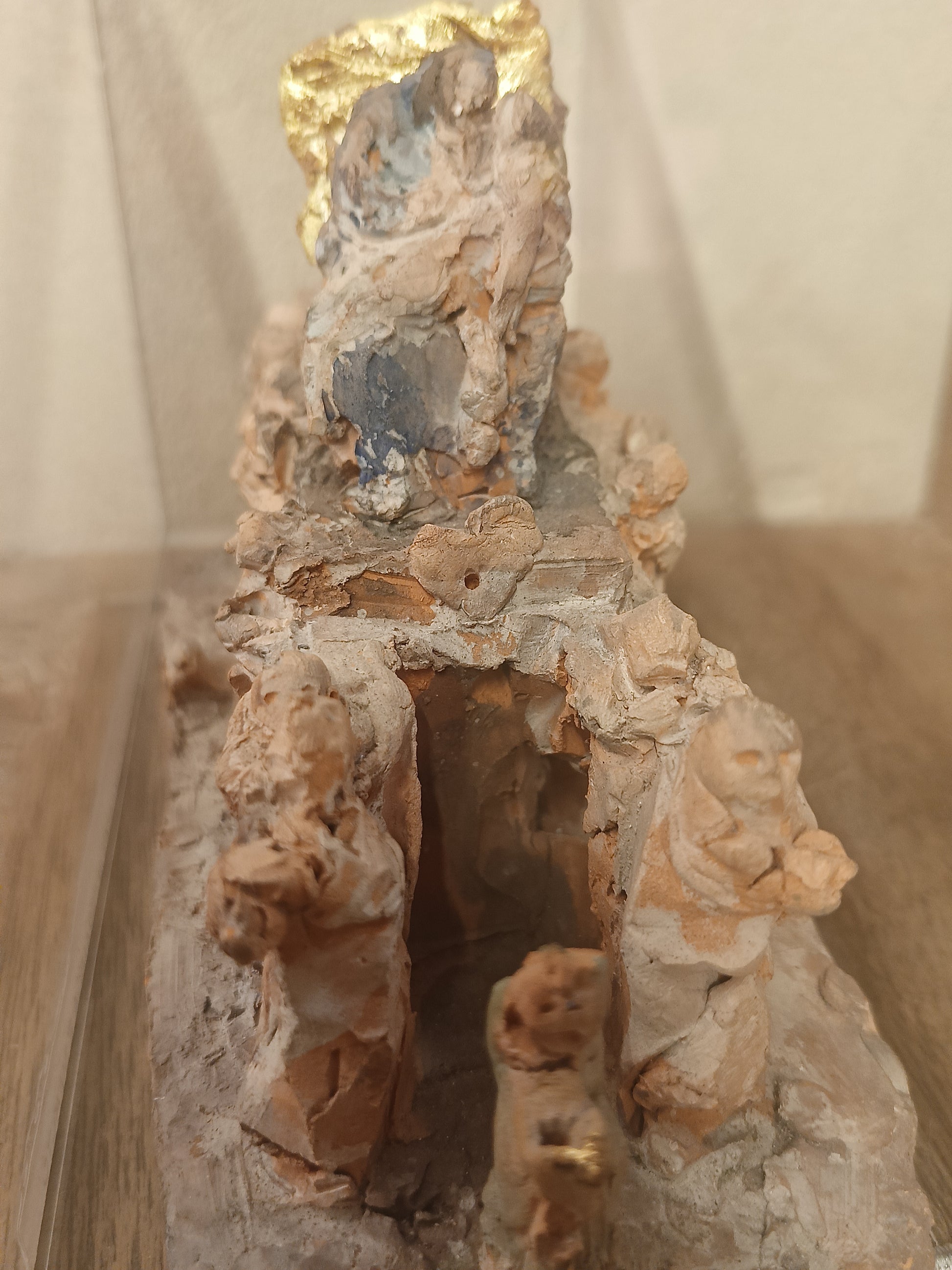 Opera realizzata in ceramica modellata e smalto. Scultura unica raffigurante la cassa della Pietà. Dimensioni altezza 14cm, larghezza 24cm, profondità 10,5cm